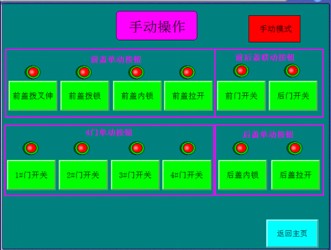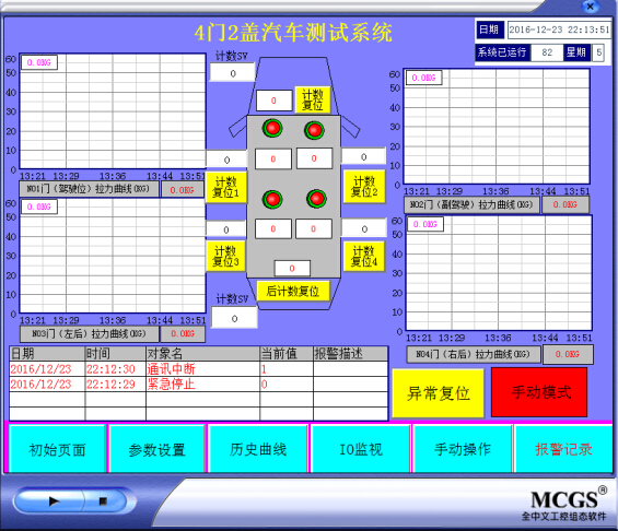 1、主画面 n 4个门实时曲线显示 n 各门的运行指示和测试次数显示 n 门开关实时动态显示 n 计数复位、异常复位 n 实时报警、手动自动切换