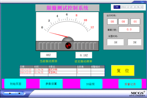1、主画面 n 振动频率显示和设置 n 设置运行时间并自动停机 n 实时报警显示、复位